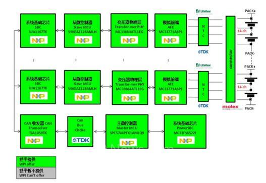 大聯(lián)大世平推出的基于NXP芯片的BMS動力電池管理系統(tǒng)解決方案,其主控單元采用了NXP SPC5774PF MCU,是一款基于Power Architecture,具有l(wèi)ock step核的高性能、高安全性MCU。SBC系統(tǒng)基礎(chǔ)芯片NXP UJA1167TK提供多種可配置的電源選擇,MCU搭配SBC系統(tǒng)基礎(chǔ)芯片可實(shí)現(xiàn)更高的安全等級。類比前端NXP MC33771負(fù)責(zé)電池資料的采集,一個MC33771最多可接14節(jié)單體電池,多個MC33771可以級聯(lián)形成菊輪煉式通信。大聯(lián)大世平提供的BMS解決方案具有極大的靈活性,可滿足不同客戶的需求。