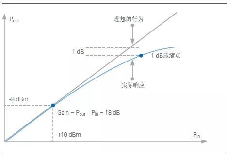 射頻PA的兩個(gè)重要特性是增益和輸出功率。增益用來(lái)表示設(shè)備輸入功率與輸出功率之間的關(guān)系。通常當(dāng)PA的增益在較寬的輸入功率電平范圍內(nèi)維持相對(duì)恒定,但是當(dāng)輸出功率趨近于設(shè)備飽和區(qū)時(shí),增益開(kāi)始下降。這一效應(yīng)稱(chēng)為增益壓縮。