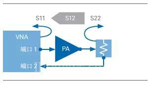 在某些情況下,測(cè)量輸出回波損耗可能需要對(duì)測(cè)試配置進(jìn)行微調(diào),如圖8所示。PA輸出端和VNA端口2之間所需的衰減可能相對(duì)較高,尤其是對(duì)于高增益PA。在這種情況下,高PA增益和相對(duì)較低的回波損耗會(huì)產(chǎn)生功率極低的反射信號(hào),并由VNA的端口2進(jìn)行測(cè)量。因此,對(duì)高增益PA進(jìn)行精確的S22參數(shù)測(cè)量通常需要使用衰減器來(lái)生成比放大器增益更低的損耗。在這些情況下,通常針對(duì)S11、S12和S21測(cè)量使用一個(gè)衰減值,針對(duì)S22測(cè)量使用另一個(gè)衰減值。