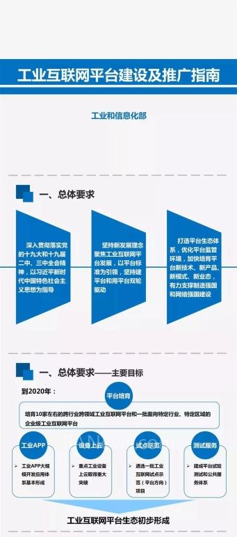 《指南》提出,到2020年,培育10家左右的跨行業(yè)跨領(lǐng)域工業(yè)互聯(lián)網(wǎng)平臺(tái)和一批面向特定行業(yè)、特定區(qū)域的企業(yè)級(jí)工業(yè)互聯(lián)網(wǎng)平臺(tái),工業(yè)APP大規(guī)模開發(fā)應(yīng)用體系基本形成,重點(diǎn)工業(yè)設(shè)備上云取得重大突破,遴選一批工業(yè)互聯(lián)網(wǎng)試點(diǎn)示范(平臺(tái)方向)項(xiàng)目,建成平臺(tái)試驗(yàn)測(cè)試和公共服務(wù)體系,工業(yè)互聯(lián)網(wǎng)平臺(tái)生態(tài)初步形成。