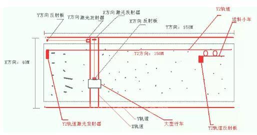 ● Y方向150米軌道,Y2方向150米軌道,X方向40米軌道實(shí)現(xiàn)工位正負(fù)5毫米的定位精度;每個(gè)工位的定位由PLC根據(jù)激光位移實(shí)事距離的信號(hào)計(jì)算直接得到;
