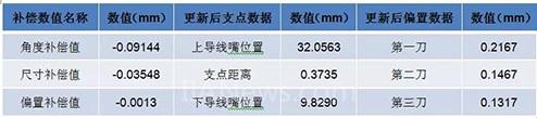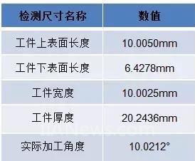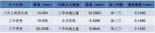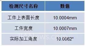使用更新后的支點(diǎn)數(shù)據(jù)和偏置再次進(jìn)行加工驗(yàn)證,加工后檢測相應(yīng)尺寸數(shù)據(jù)如下表所示: