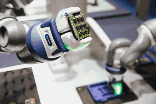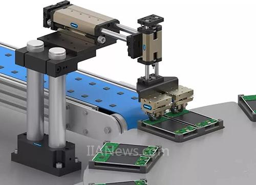 電子行業(yè)應用示例:在雄克快速取放單元中,兩個 MPC 機械手一組,抓取并搬運電子元件。