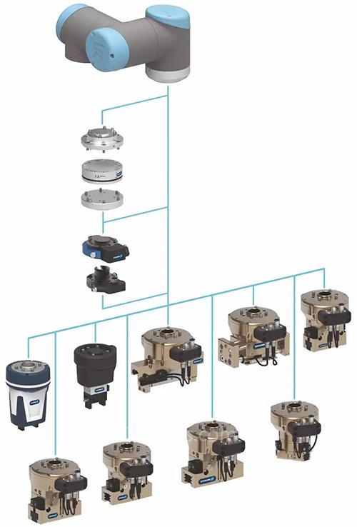 末端模塊化系統(tǒng)包括構成機器人臂端解決方案的快換裝置、防纏繞機構、補償裝置、驅動工具以及各種類型的傳感器。雄克提供全面的末端模塊化系統(tǒng)專業(yè)知識和成熟方案。以 UR 機器人為基礎,雄克新推出了機器人末端模塊化系統(tǒng)套組(End-of-Arm kit),包括電氣和協(xié)作機械手等共 36 種組合方式。