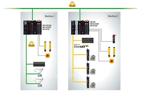 ? NX系列安全網(wǎng)絡(luò)控制器加上NX102機器自動化控制器,可通過EtherCAT?和FSoE最多對12個電機提供實時安全控制。