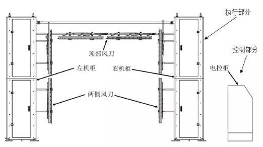 離子風(fēng)裝置是用于汽車涂裝車間自動(dòng)化的車身除塵除靜電系統(tǒng)。通常車身油漆涂層從里到外依次為:電泳層、中涂層、色漆層、清漆層。此套系統(tǒng)用于中涂及面漆工藝段,在車身噴漆前除去灰塵及靜電。圖1-1為離子風(fēng)裝置示意圖: