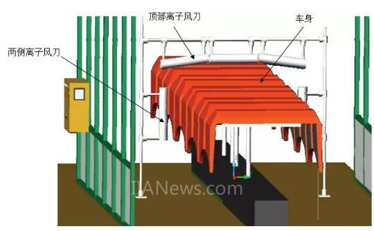 車身在經(jīng)過(guò)風(fēng)刀時(shí),左右兩側(cè)的風(fēng)刀完成車身兩側(cè)的除靜電工作,而可上下移動(dòng)的頂部風(fēng)刀完成車頂及前后蓋的除靜電工作。在車行進(jìn)的過(guò)程中頂部風(fēng)刀隨時(shí)根據(jù)車體各部分高度調(diào)整自身的高度和出風(fēng)角度,完美解決了車身各部分不同高度除靜電的問題,同時(shí)還可適應(yīng)多種車型,保證各種車型最理想的除靜電和去灰塵效果。圖1-2為離子風(fēng)刀工作示意圖: