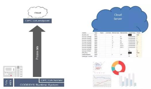 同時(shí),OPC UA Server作為CODESYS Runtime的組件之一,可實(shí)現(xiàn)基于不同硬件架構(gòu)或不同操作系統(tǒng)的設(shè)備之間以及設(shè)備與工廠之間的數(shù)據(jù)交換和傳輸。設(shè)備端與云端通過(guò)OPC UA通信,可以真正實(shí)時(shí)地、跨時(shí)區(qū)地將過(guò)程數(shù)據(jù)上傳到云端,實(shí)現(xiàn)基于人工智能算法的數(shù)據(jù)分析、數(shù)據(jù)監(jiān)控、數(shù)據(jù)存儲(chǔ)、智能控制等功能。