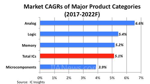 據(jù)IC Insights預測,2018年集成電路的銷售額將增長8%左右,2017年的增長約為22%。而電源管理IC、專用模擬芯片和信號轉換器的強勁銷售預計將成為未來五年模擬增長的主要推動力。而在近年來中國模擬芯片市場上,智能終端設備、汽車電子等下游驅動力在近幾年推動了對模擬芯片的需求,一些優(yōu)秀的中國本土廠商也正在快馬加鞭迎頭趕上,在門檻極高的模擬領域實現(xiàn)突破。