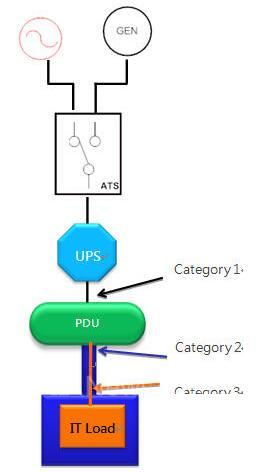 相對(duì)的各系統(tǒng)的可靠性及電力系統(tǒng)量測(cè)位置會(huì)對(duì)PUE有不同的結(jié)果,因此IT設(shè)備用電量測(cè)位置有三處,分為UPS的輸出、PDU(配電設(shè)備)的輸出及IT設(shè)備的實(shí)際用電如圖1標(biāo)示說(shuō)明,提供給使用者量測(cè)依據(jù),作為能源使用效率評(píng)估的比較基準(zhǔn),此三種量測(cè)在量側(cè)位置及取樣時(shí)間有差異,但這三種PUE量測(cè)均可以為下列改變作來(lái)評(píng)估依據(jù):