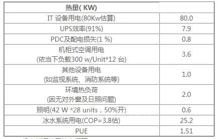如此的規(guī)劃是否可以在可靠性不妥善的狀況下,做到節(jié)能的要求,我們依規(guī)劃使用的產(chǎn)品及解決方案的特性,計(jì)算此機(jī)房于運(yùn)行的狀況下可能的PUE值,如下表3-1,因此機(jī)房并非于樓頂層,且直接與外墻接觸的部份已經(jīng)規(guī)劃為維修信道,環(huán)境熱負(fù)荷量將影響有限,位置選擇也供獻(xiàn)部分節(jié)能。