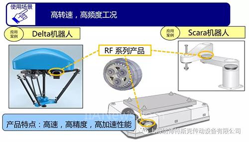 RF系列產(chǎn)品由于其減速比較低,使其擁有在兼顧高精度的同時還能輸出高轉(zhuǎn)速的特點(diǎn)。在一些需要較高輸出轉(zhuǎn)速的工況大放異彩,比如Delta機(jī)器人,Scara機(jī)器人或者AGV車的驅(qū)動輪部位。值得一提的是,通過注入食品等級潤滑油脂,RF系列同樣能夠應(yīng)用在一些食品加工領(lǐng)域。