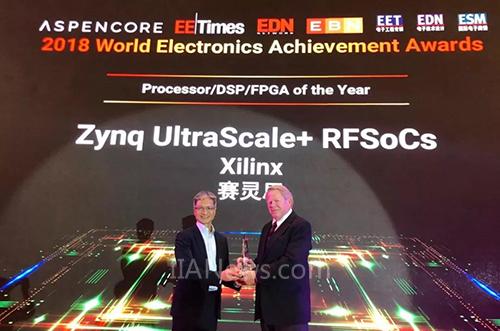 圖:美國(guó) Aspencore 雜志總編 Richard Quinnell將 Zynq UltraScale+ RFSoC 2018 年度最佳產(chǎn)品獎(jiǎng) (處理器、DSP/FPGA 類)授予賽靈思公司全球總裁兼 CEO Victor Peng先生