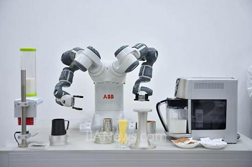 這套展品展示了全套機(jī)器人沖咖啡方案,包括緊湊美觀的咖啡吧臺、YuMi人機(jī)互動界面、語音智能提示,趣味性、互動性強(qiáng)。