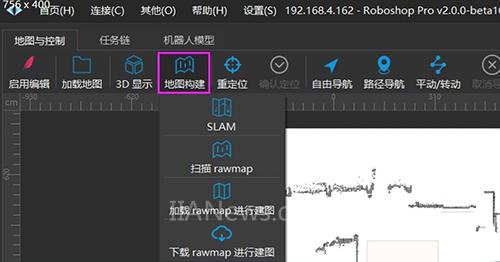 打開Roboshop Pro ,成功連接機器人后,雙擊機器人進(jìn)入【地圖與控制】界面。 點擊模塊工具欄中的【地圖構(gòu)建】,會彈出構(gòu)建地圖的所有方式。
