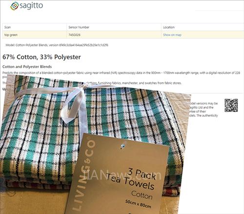 許多國家要求明確標(biāo)識紡織品的纖維成分。有時(shí)這些標(biāo)簽會產(chǎn)生誤導(dǎo)。例如,在下圖中,我們看到一組標(biāo)有100%棉的洗碗巾,但是經(jīng)Sagitto測試后,發(fā)現(xiàn)是67%棉和33%滌綸的混合物。