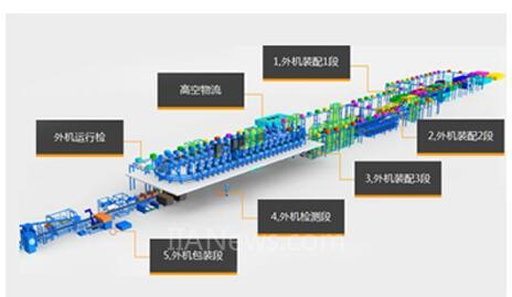 空調外機自動化線主要包含外機裝配1段、外機裝配2段、外機裝配3段、外機檢測段、外機運行檢、外機包裝段和高空物流 七個部分。整個項目;使用機械手100多臺,傳感器5000多個,申請專利近500項。