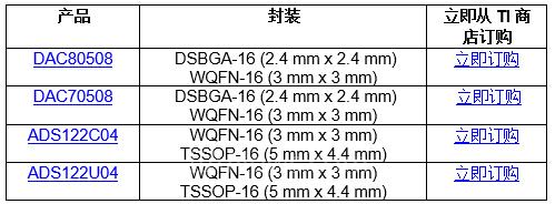TI新微型DAC和ADC的封裝與定價(jià)見下表。TI商店和授權(quán)經(jīng)銷商供應(yīng)DAC80508、DAC70508、ADS122C04和ADS122U04設(shè)備的產(chǎn)量與價(jià)格。