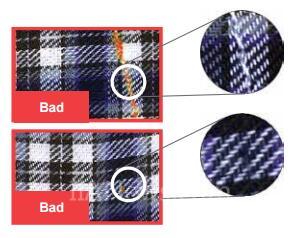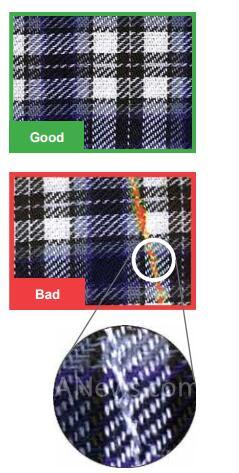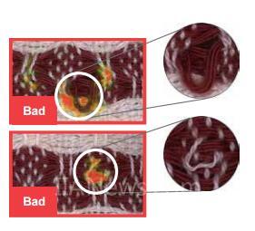 在檢測階段,紅色檢查工具可以報告面料上如下圖中顯示的這類缺陷區(qū)域:經紗和緯紗中的針織成圈缺陷