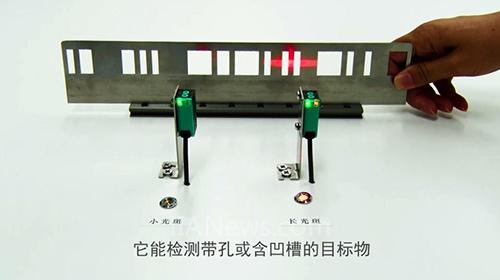 長(zhǎng)光斑產(chǎn)品的另一個(gè)優(yōu)勢(shì)體現(xiàn)在它能檢測(cè)帶孔或含凹槽的目標(biāo)物。左邊的小光斑在目標(biāo)物通過(guò)時(shí)輸出一直跳動(dòng);而右邊的長(zhǎng)光斑產(chǎn)品可以穩(wěn)定檢測(cè)。