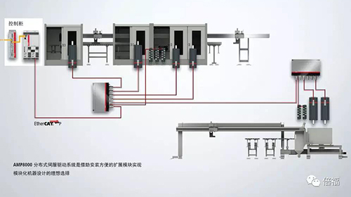 AMP8000 分布式伺服驅(qū)動(dòng)系統(tǒng)為實(shí)現(xiàn)模塊化機(jī)器設(shè)計(jì)提供了理想的支持。為此,伺服驅(qū)動(dòng)器直接集成到伺服電機(jī)中,全部采用高度緊湊的設(shè)計(jì)。功率電子元器件通過這種方式被重新放置到機(jī)器中,控制柜內(nèi)只需要安置一個(gè)耦合模塊。此外,分布式配電模塊和通用 EtherCAT P 解決方案進(jìn)一步優(yōu)化了模塊化機(jī)器設(shè)計(jì)方法。