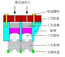 缸體疲勞試驗是通過向發(fā)動機燃燒室注入的液壓油壓力模擬發(fā)動機爆發(fā)壓力,液壓油壓力同時作用于缸體(缸套)、工藝缸蓋、工藝活塞上,并通過工藝連桿、曲軸傳遞給主軸承壁和主軸承蓋,如圖1。