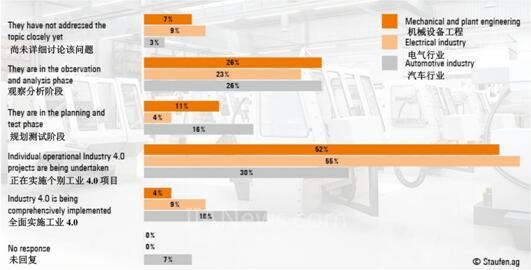 如上圖顯示,不同的行業(yè)走向智能工廠的發(fā)展水平是非常不同的。汽車工業(yè)顯然在端到端運營理念方面走在最前面。如圖,工業(yè)4.0已經在將近五分之一(18%)的公司中完全運作。而機械設備工程行業(yè)僅達到4%,仍有很大的發(fā)展空間,與電氣行業(yè)一樣,目前的重點是單一的個別項目。