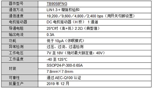 東芝具備LIN從屬功能的車載直流電機(jī)驅(qū)動(dòng)器IC樣品開始發(fā)貨