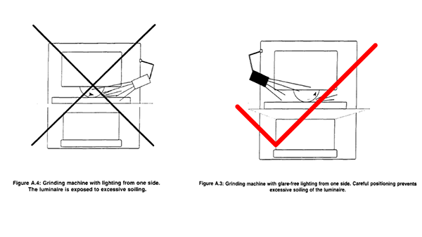 ● 燈具選擇時應符合GB7000,安裝時,應當提供工作需要的照明,并且避免對工作的干擾和對操作的危害;盡可能減少燈具及光源表面的灰塵積累;并方便維修保養(yǎng)。如在下圖所示的砂輪機的例子中,正確的燈具安裝位置,就能有效防止飛濺的顆粒對燈具產(chǎn)生的影響。