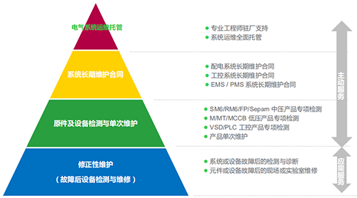 以施耐德電氣的服務(wù)業(yè)務(wù)為例,在電力和工業(yè)領(lǐng)域的服務(wù)業(yè)務(wù)覆蓋從底層PLC檢查,環(huán)網(wǎng)柜監(jiān)測,乃至整個工廠工業(yè)系統(tǒng)的運維托管。這里既包括了基礎(chǔ)的應(yīng)需服務(wù),如:系統(tǒng)或設(shè)備故障后的檢測與診斷、元件或設(shè)備故障后的現(xiàn)場或?qū)嶒炇揖S修;也包括涵蓋電氣系統(tǒng)運維托管、系統(tǒng)長期維護、原件及設(shè)備檢測維護的主動式服務(wù)。