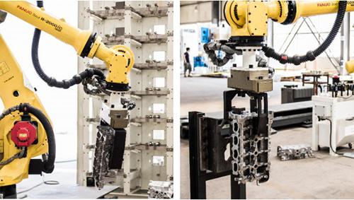 據(jù)戴屹技術(shù)負(fù)責(zé)人王先生介紹,上文所提到的汽車生產(chǎn)自動化打磨去毛刺項目由FANUC機(jī)器人、中轉(zhuǎn)臺、戴屹打磨間和雄克機(jī)械手等組成,整個流程包括冷卻、去砂、切冒口、首次打磨和二次打磨五道工序。