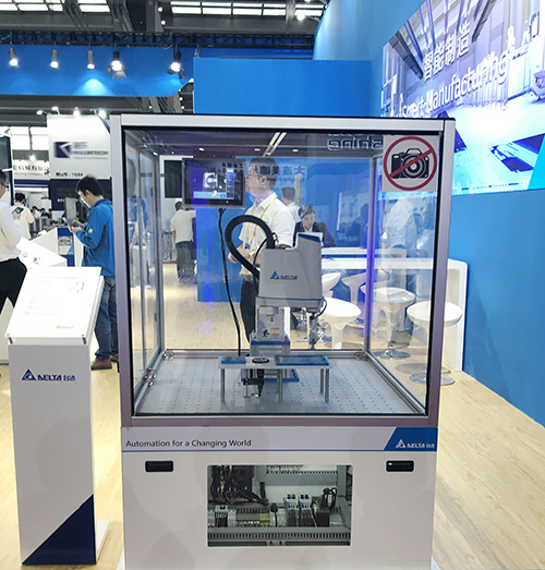 圖2臺(tái)達(dá)展出以控制驅(qū)動(dòng)一體機(jī)ASDA-MS系列為核心的多關(guān)節(jié)機(jī)器人解決方案。