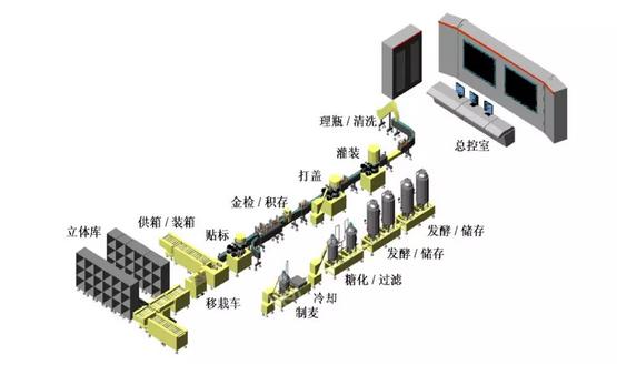 模擬生產(chǎn)線實(shí)驗(yàn)裝置系統(tǒng)由16個(gè)工藝分部及2個(gè)功能擴(kuò)展平臺(tái)組成,包括:模擬啤酒釀制生產(chǎn)工藝過程的制麥、糖化、過濾、發(fā)酵、熟化、殺菌、儲(chǔ)存等7個(gè)分部,模擬啤酒灌裝、裝箱、入庫(kù)等生產(chǎn)工藝過程的理瓶、清洗、灌裝、封蓋、金檢、貼標(biāo)、裝箱、移載、入庫(kù)等9個(gè)分部及虛擬仿真實(shí)驗(yàn)平臺(tái)和智能制造中央控制系統(tǒng)平臺(tái)。