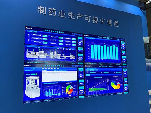 圖2臺達現(xiàn)場以電視墻的形式展示制藥業(yè)生產可視化管理解決方案,可實時顯示遠端生產設備的運作信息,達成設備互通標準化,信息透明化、數(shù)字化化的高效智能設備管理目標。