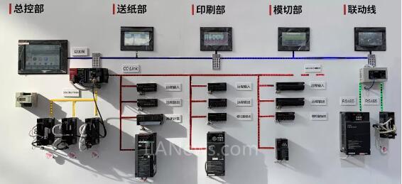 所有控制程序由單臺PLC完成,程序以及數(shù)據(jù)集中,調(diào)試方便。各工藝間采用CC-Link總線控制,最高速度達到10Mbps,連接64個站。伺服前緣送紙系統(tǒng),采用高速光纖、SSCNETIII/H總線網(wǎng)絡(luò)通訊,網(wǎng)速達到150Mbps,可滿足客戶高速、高精度要求。
