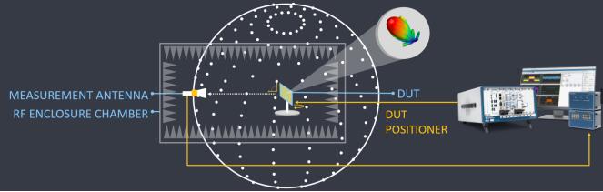 毫米波與MIMO的融合在即將到來(lái)的5G時(shí)代催生了新的測(cè)試技術(shù)與之適配,例如OTA測(cè)試。在現(xiàn)有5G OTA測(cè)試過(guò)程中,要求在DUT周圍的3D空間部署數(shù)千個(gè)測(cè)試節(jié)點(diǎn),并進(jìn)行RF功率測(cè)量。通常測(cè)試人員會(huì)旋轉(zhuǎn)DUT以節(jié)省測(cè)試空間與時(shí)間,但由于測(cè)量節(jié)點(diǎn)眾多,旋轉(zhuǎn)DUT以及與測(cè)量設(shè)備的協(xié)調(diào)將不可避免地引起延遲。