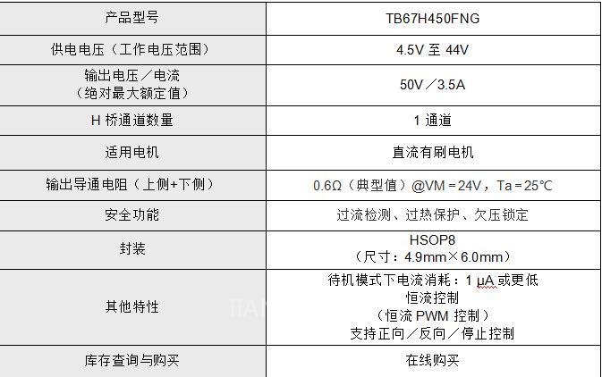 東芝電子元件及存儲(chǔ)裝置株式會(huì)社(“東芝”)今日宣布,推出其有刷直流電機(jī)驅(qū)動(dòng)器IC系列產(chǎn)品的最新成員“TB67H450FNG”。新產(chǎn)品最大額定值為50V/3.5A[1],能以寬泛的工作電壓驅(qū)動(dòng)電機(jī)。此外,該產(chǎn)品采用兼容引腳分配的小型HSOP8表面貼裝進(jìn)行封裝,適用性更強(qiáng)。今天開始量產(chǎn)。