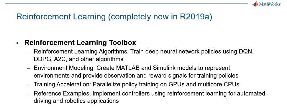 實(shí)際上是工程師逐漸地有意識地訓(xùn)練這套算法,指引算法執(zhí)行正確的決定。這是增強(qiáng)學(xué)習(xí)工具箱里面最基本的理念。MATLAB并不去設(shè)定行為的正確與否。這個工具箱是訓(xùn)練對象去符合某一種行為的規(guī)范。目前大部分競爭者的AI屬于比較狹窄應(yīng)用領(lǐng)域的AI,而增強(qiáng)學(xué)習(xí)工具箱就是希望能夠把這種AI,應(yīng)用到工控領(lǐng)域中去。
