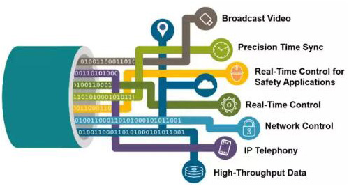 時(shí)間敏感網(wǎng)絡(luò)TSN開始登場(chǎng),它專門針對(duì)不同數(shù)據(jù)響應(yīng)速度要求的特點(diǎn),提供了一種網(wǎng)絡(luò)彈性的保障機(jī)制。例如,在現(xiàn)代工廠控制中,既有大量實(shí)時(shí)數(shù)據(jù)的通訊與控制,也有許多監(jiān)視器的監(jiān)測(cè),以及各種無線數(shù)據(jù),使得現(xiàn)場(chǎng)的數(shù)據(jù)形成了擁擠的跑道,充滿了大量結(jié)構(gòu)化實(shí)時(shí)信息和非結(jié)構(gòu)化信息(如音頻、視頻流)等各種不同類型的數(shù)據(jù),對(duì)數(shù)據(jù)同步的精度要求比較高。在控制器之間進(jìn)行通訊時(shí),可以利用TSN的功能按信息傳輸?shù)膬?yōu)先級(jí)加以協(xié)調(diào),從而在復(fù)雜的現(xiàn)場(chǎng)情況下保障各種通訊的協(xié)調(diào)一致性。