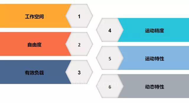 表示機(jī)器人特性的基本參數(shù)和性能指標(biāo)主要有工作空間、自由度、有效負(fù)載、運(yùn)動(dòng)精度、運(yùn)動(dòng)特性、動(dòng)態(tài)特性等。