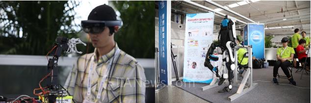 亮相2018年世界機器人大賽賽場的腦控機械臂系統(tǒng)(左)和腦控外骨骼系統(tǒng)(右)