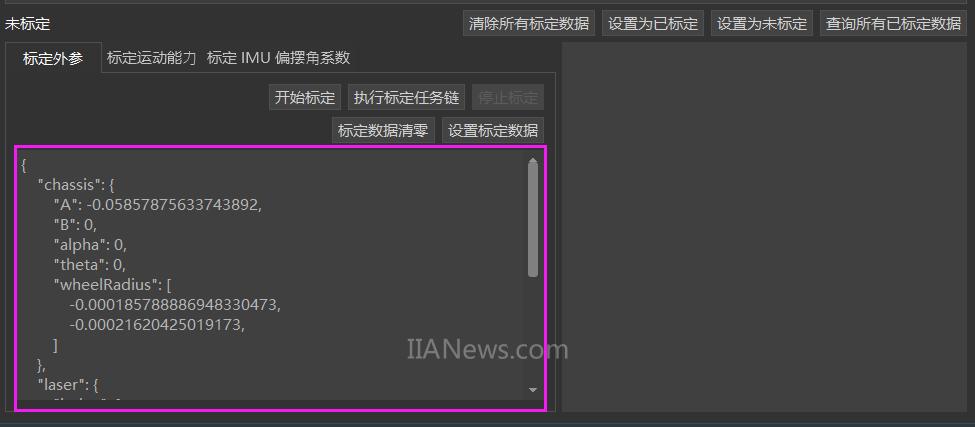 (6)等待機器人完成所有導(dǎo)航后,點擊【停止標定】,在下方的輸出區(qū)域查看所得到的標定參數(shù)達到預(yù)期要求: