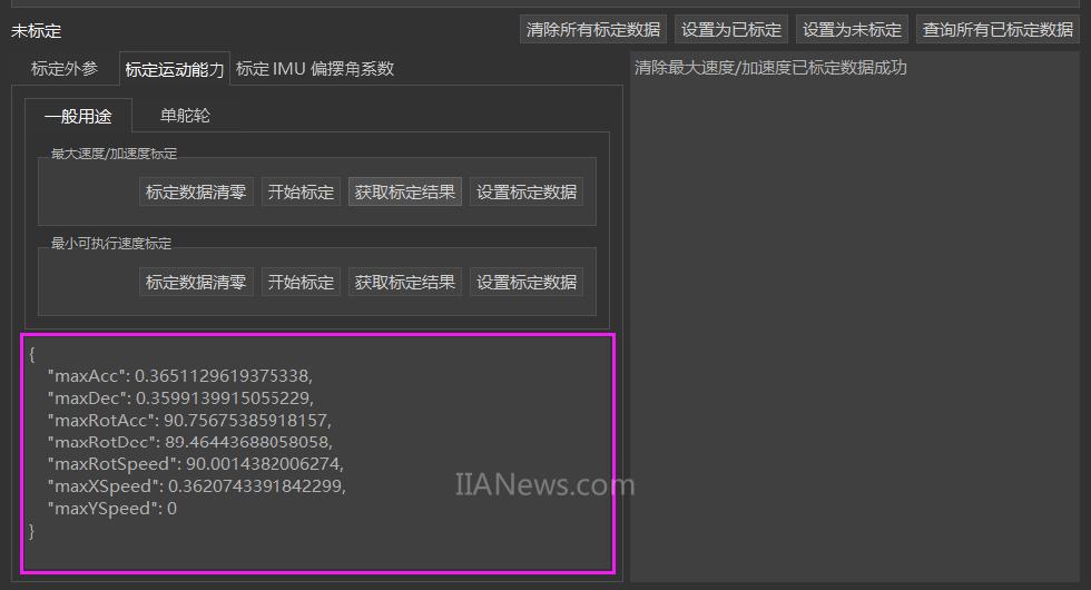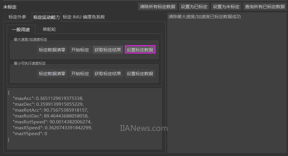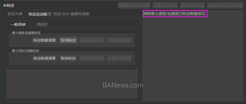 【標定數(shù)據(jù)清零】:手動清除機器人中已經(jīng)存在的 【最大速度/加速度標定數(shù)據(jù)】,一般只在調(diào)試時使用此功能,實際使用中無需點擊該按鈕。
