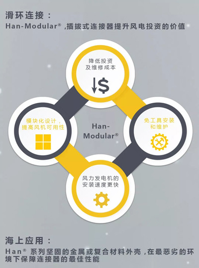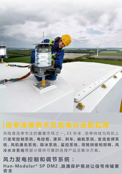 憑借幾十年行業(yè)應(yīng)用經(jīng)驗(yàn)的積淀,浩亭的高性能連接器產(chǎn)品被廣泛應(yīng)用于風(fēng)機(jī)上的變槳控制系統(tǒng)、電控柜、滑環(huán)、剎車、偏航系統(tǒng)等重要組成部分。