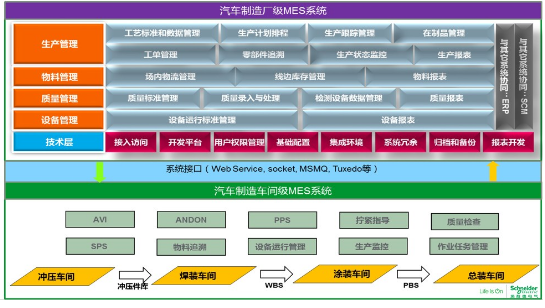除了已有的這三大模塊和Intouch Scada軟件外,施耐德針對國內(nèi)車企特定需求進(jìn)行相關(guān)功能定制開發(fā),最終形成了施耐德汽車行業(yè)MES解決方案。見下圖: