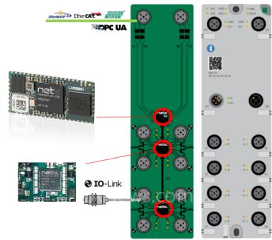 基于赫優(yōu)訊的最新的網(wǎng)絡(luò)控制芯片netX90和四通道IO-Link智能收發(fā)器的netIOL,可以非常便捷的實(shí)現(xiàn)IO-Link主站到實(shí)時(shí)以太網(wǎng)從站協(xié)議(比如:Profinet、Ethernet/IP或EtherCAT)以及IoT物聯(lián)網(wǎng)協(xié)議OPC UA的開(kāi)發(fā)。。netX90芯片內(nèi)部集成兩個(gè)ARM Cortex-M4處理器內(nèi)核,其中一個(gè)專門(mén)用于處理通訊協(xié)議,另一個(gè)內(nèi)核則開(kāi)放給客戶,可用于應(yīng)用程序的開(kāi)發(fā)。netIOL芯片是一款智能的IO-Link收發(fā)器,內(nèi)部集成32bit CPU,不僅能實(shí)現(xiàn)4端口IO-Link主站接口,而且也能配置成普通的DI或DO通道,同時(shí)內(nèi)部集成的AD控制器可以實(shí)現(xiàn)監(jiān)控電流/電壓的量程范圍。netX90芯片與netIOL收發(fā)器之間可通過(guò)SPI接口進(jìn)行連接,當(dāng)訪問(wèn)8端口IO-Link主站時(shí),其同步周期能達(dá)到400us。一個(gè)netX90芯片最多能連接4個(gè)netIOL,可實(shí)現(xiàn)16端口的IO-Link主站。
