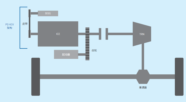 前端附件傳動裝置上的HEV P0架構,其中電機或BiSG通過皮帶連接到內燃機(ICE)。