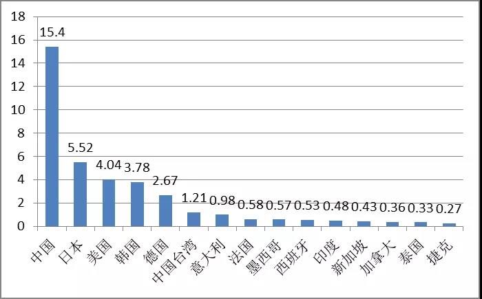 圖2 2018年工業(yè)機(jī)器人銷量排名前15市場(chǎng)(單位:萬臺(tái))