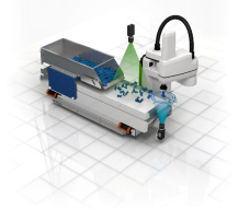 在該產(chǎn)線中,經(jīng)過(guò)相機(jī)—機(jī)器人坐標(biāo)系校準(zhǔn)后,歐姆龍Anyfeeder智能送料系統(tǒng)中的集成式視覺(jué)架構(gòu)可高速鎖定機(jī)器人位置,再由定位器模型獲取振動(dòng)盤內(nèi)符合條件的工件坐標(biāo),最終將拍攝到的工件坐標(biāo)傳遞給機(jī)器人。