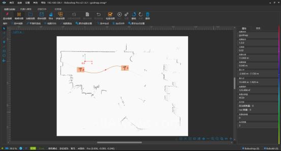 地圖構(gòu)建完成后,便需要進行站點部署及機器人路徑規(guī)劃。在仙知機器人可視化操作軟件Roboshop中進行地圖路徑規(guī)劃時,由于軟件中有三階貝塞爾曲線,可進行任意曲線編輯,方便用戶根據(jù)實際場景進行操作,輕松實現(xiàn)對移動機器人的路徑規(guī)劃。